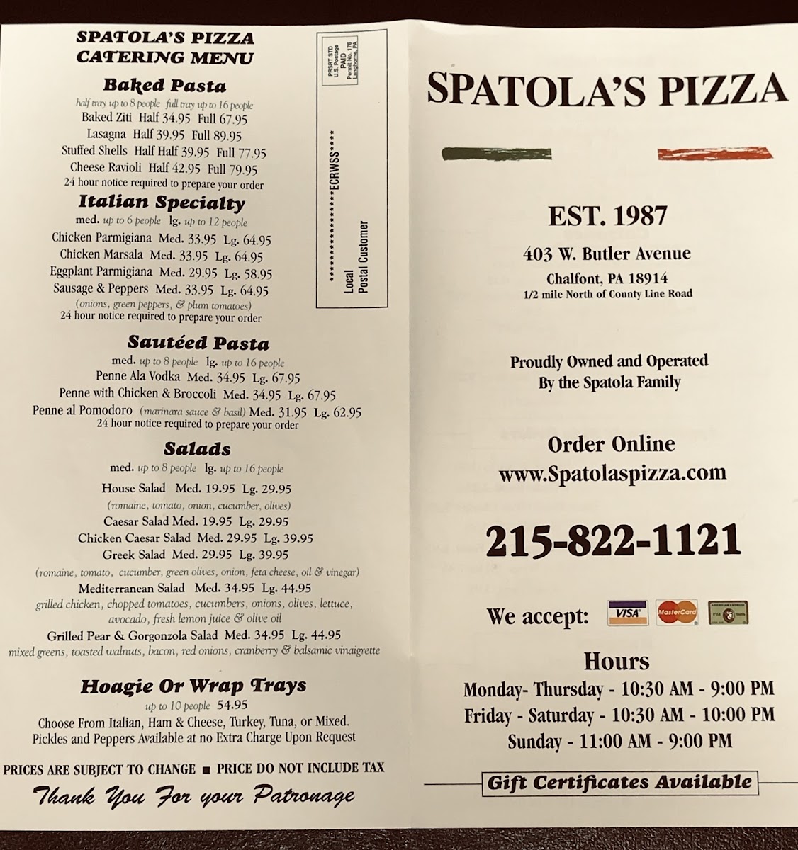 When it comes to satisfying your cravings for delicious pizza, Spatola's Pizza Menu is the place to check out. Located at 403 W Butler Ave, Chalfont, PA, this local gem has a variety of mouthwatering options that are perfect for every taste. Whether you're in the mood for a classic Margherita pizza with fresh mozzarella and basil, or something more adventurous like their BBQ chicken pie, there's something on the menu for everyone. The crust is always perfectly crispy, and the toppings are generous and flavorful. Don't forget to try their famous garlic knots, which are the ideal side to any pizza. If you're not feeling pizza, there are also plenty of fresh salads, pastas, and subs to choose from. Spatola's really has it all, making it the perfect spot for a casual meal with friends or family. So next time you're near Chalfont, stop by and treat yourself to a slice (or two) of something special!